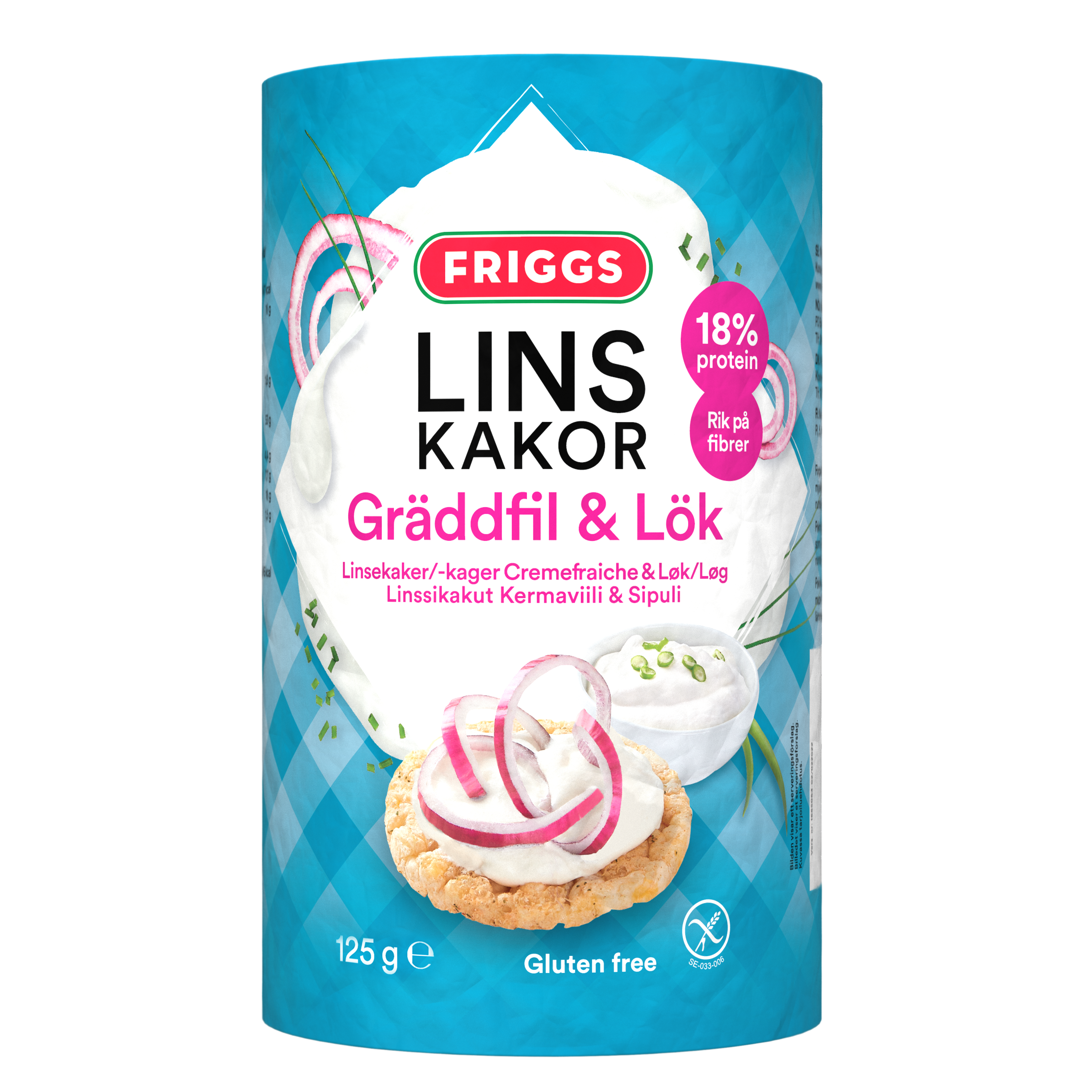 Ingredienser: Linsmjöl (47 %), majsmjöl, rapsolja, majs, kryddblandning med smak av gräddfil och lök 8,9 % (vasslepulver (från MJÖLK), salt, KÄRNMJÖLKSPULVER, ostpulver (OST, vasslepulver (från MJÖLK)), lökpulver 12 %, tomatpulver, dextros, vitlökspulver, arom, syra (äppelsyra), jästextrakt, persilja, surhetsreglerande medel (natriumdiacetat), cayennepeppar, färgämne (paprikaoleoresin)). Kan innehålla spår av soja och sesamfrö.