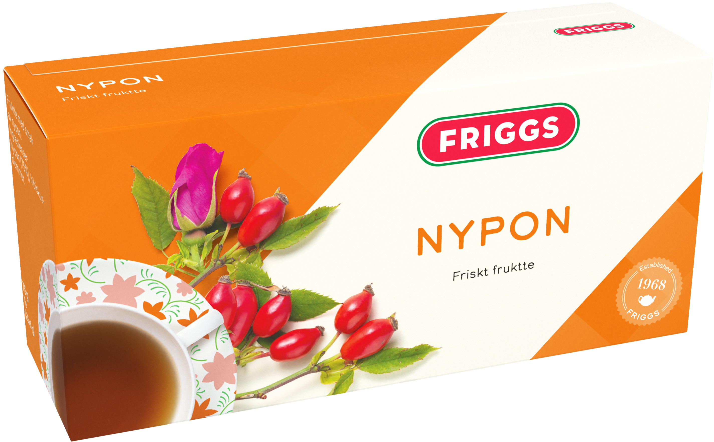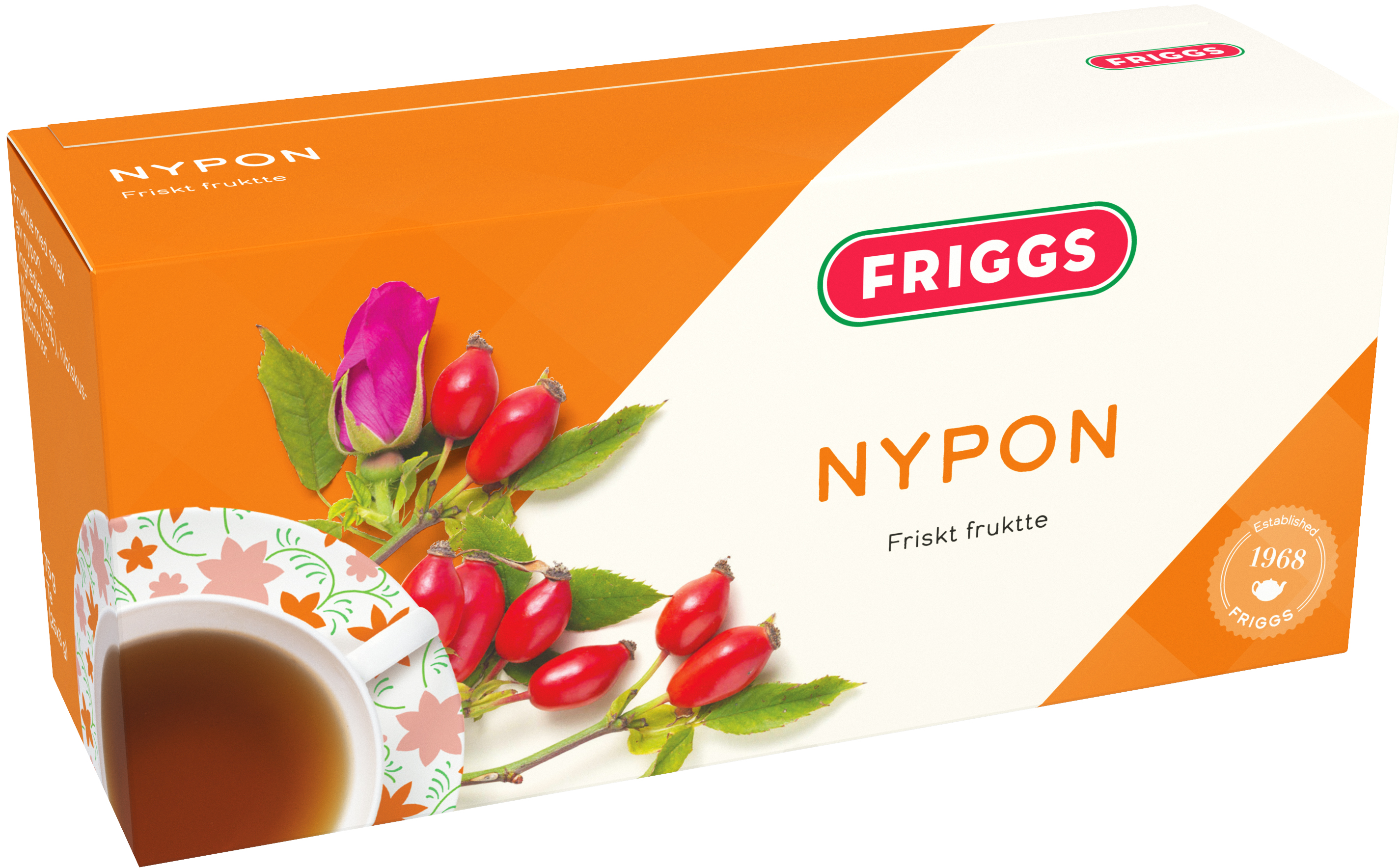 Friggs Nypon Te är ett örtte gjort på nypon och hibiskusblommor som ger teet syrligt god smak. Friggs nyponte är naturligt koffeinfritt och passar att dricka även på kvällen.