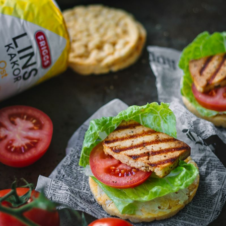 Bre på lite färskost eller majonnäs på linskakorna, lägg på en tomatskiva och en skiva grillad tofu.