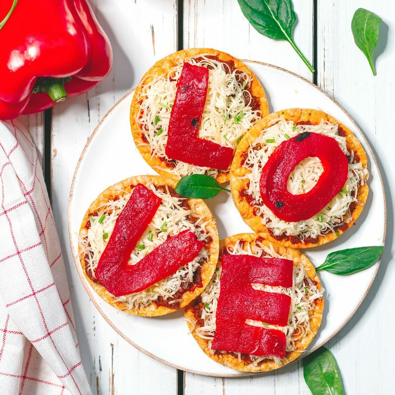 Ta paprikorna och skär dem i halvor från toppen till botten. Du borde nu ha 4 relativt platta skivor av paprika som du nu kan skära ut bokstäver ifrån (om du inte vill göra detta kan du bara skära skivor istället). Med en liten vass kniv, skär bokstäverna så att de blir ungefär lika stora. Lägg åt sidan.