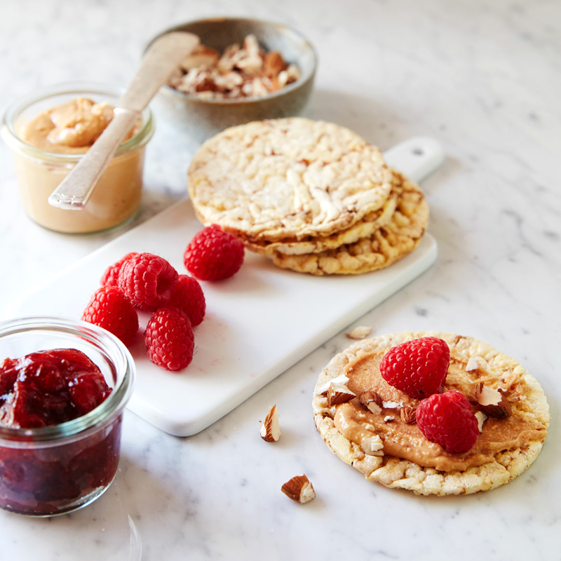 Majskakor med mandelsmör, jordgubbar och mangosalsa