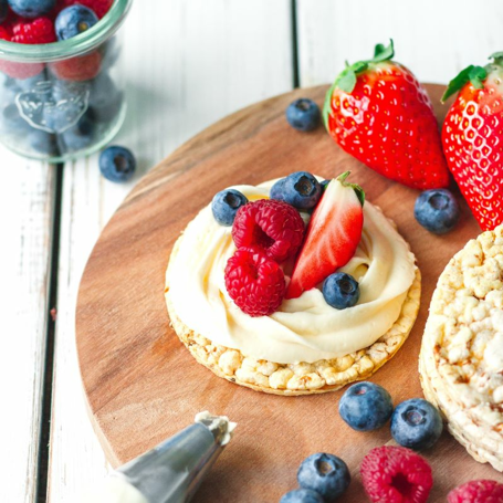 Spritsa eller bred på frostingen på majskakorna. Dekorera med färska eller frysta bär (eller med skivad frukt).